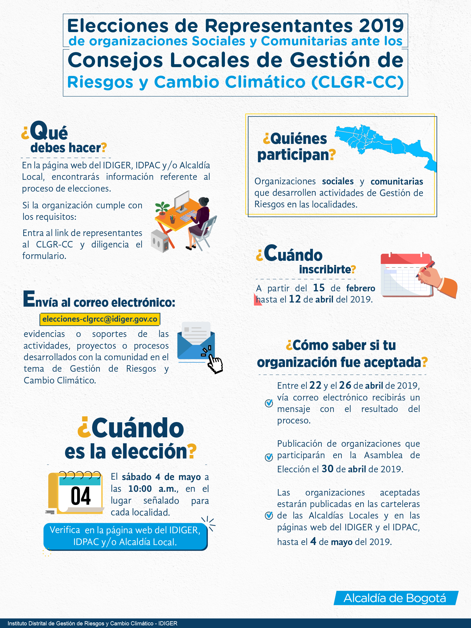Para el proceso de elección de representantes de organizaciones sociales y comunitarias ante el CLGR-CC, los y las ciudadanas que realizaron su inscripción y fue validada con su carta de acreditación, deben presentarse el 4 de mayo de 2019, a las 10:00 a.m., en el lugar relacionado a continuación, según la localidad a la que pertenezca.
