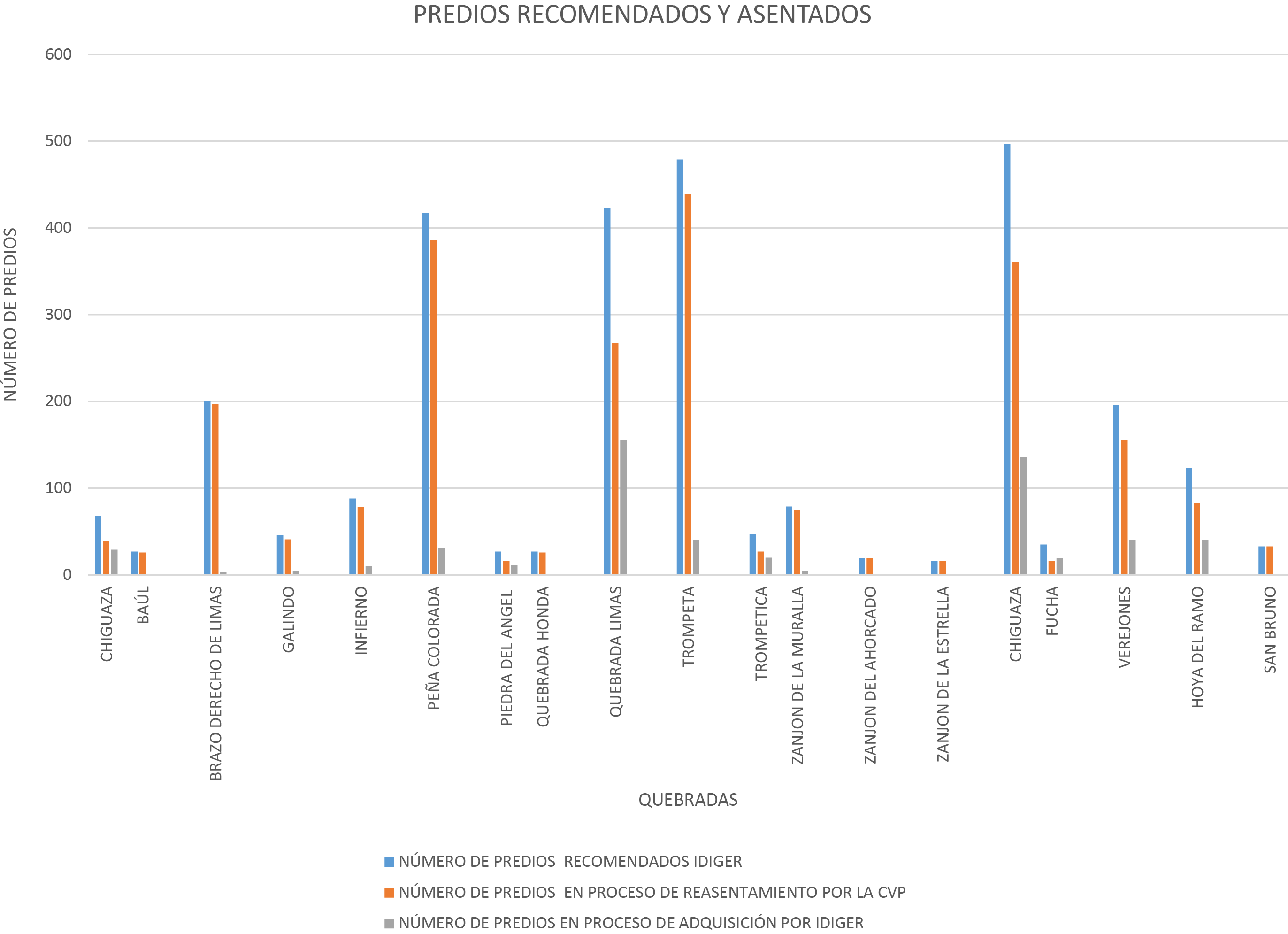 El número de predios recomendados para reasentamiento por Avenidas Torrenciales son del orden de 2814. El IDIGER ha adquirido un total de 546 predios por un valor total de 57.231. millones de pesos a mayo de 2018.