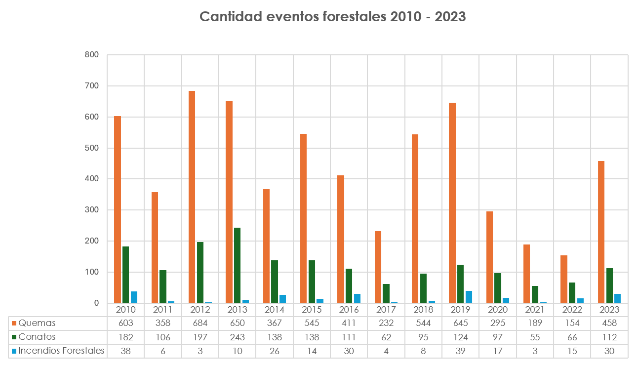 A continuación se presenta un consolidado de la ocurrencia histórica de eventos forestales, acorde con las cifras anuales entregadas por la Unidad Administrativa Especial Cuerpo Oficial de Bomberos a la Comisión Distrital para la Gestión del Riesgo por Incendios Forestales. En este sentido, en Bogotá D.C., durante el período 2010-2023, se atendieron 8.104 eventos forestales, de los cuales, 6.135 fueron catalogados como quemas, 1.726 como conatos y el restante 3% es decir, 243 eventos fueron incendios forestales, siendo 2019, el año que presentó la mayor cantidad de incendios forestales con 39 eventos.