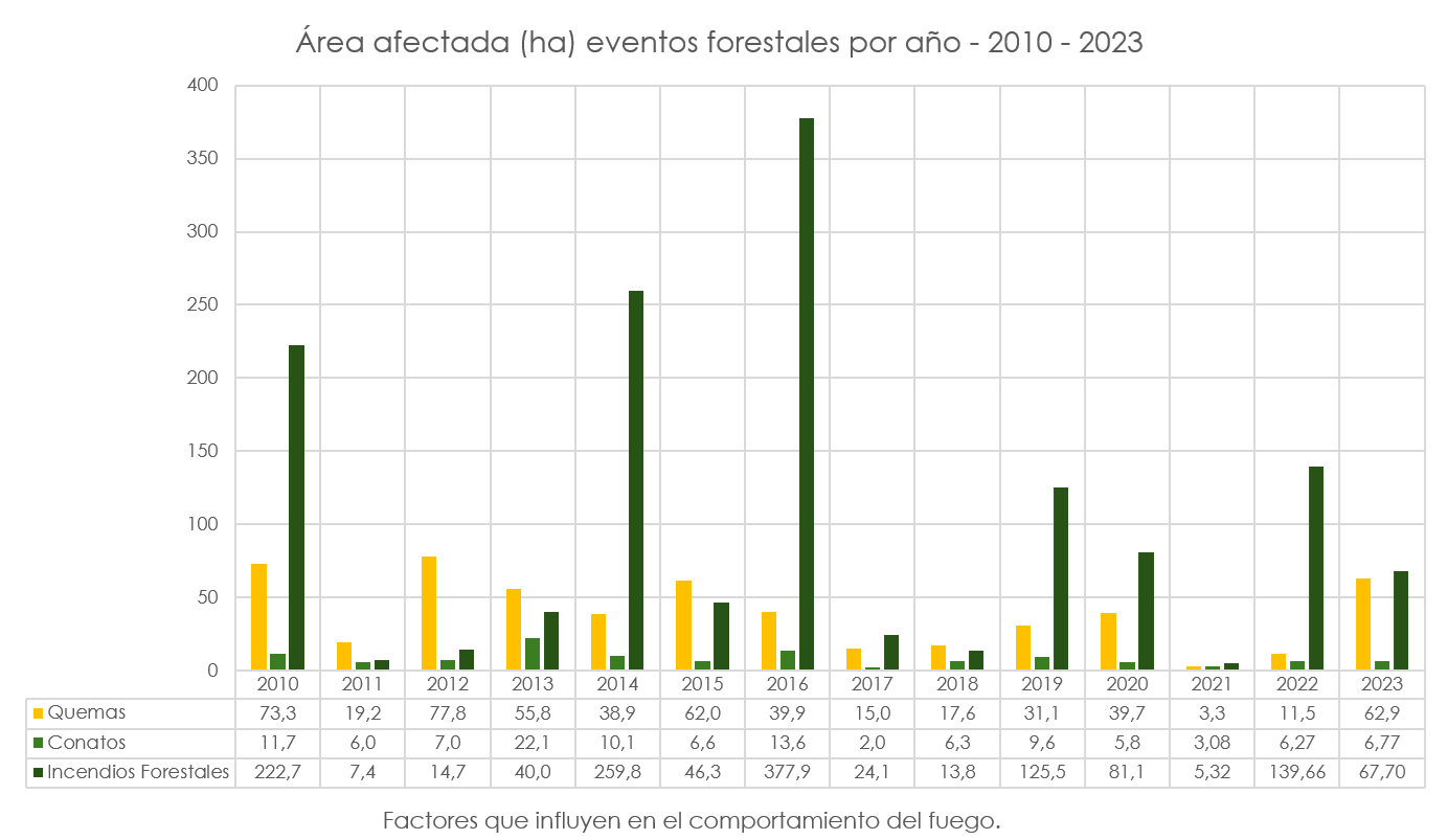 En cuanto al área afectada, el total de eventos forestales ocurridos entre 2010 y 2023 afectaron 2.090,4 hectáreas, de las cuales 1.425,8 hectáreas, equivalentes al 68,2% fueron afectadas por incendios forestales, siendo 2016 el año que presentó mayor área afectada con 377,9 ha.