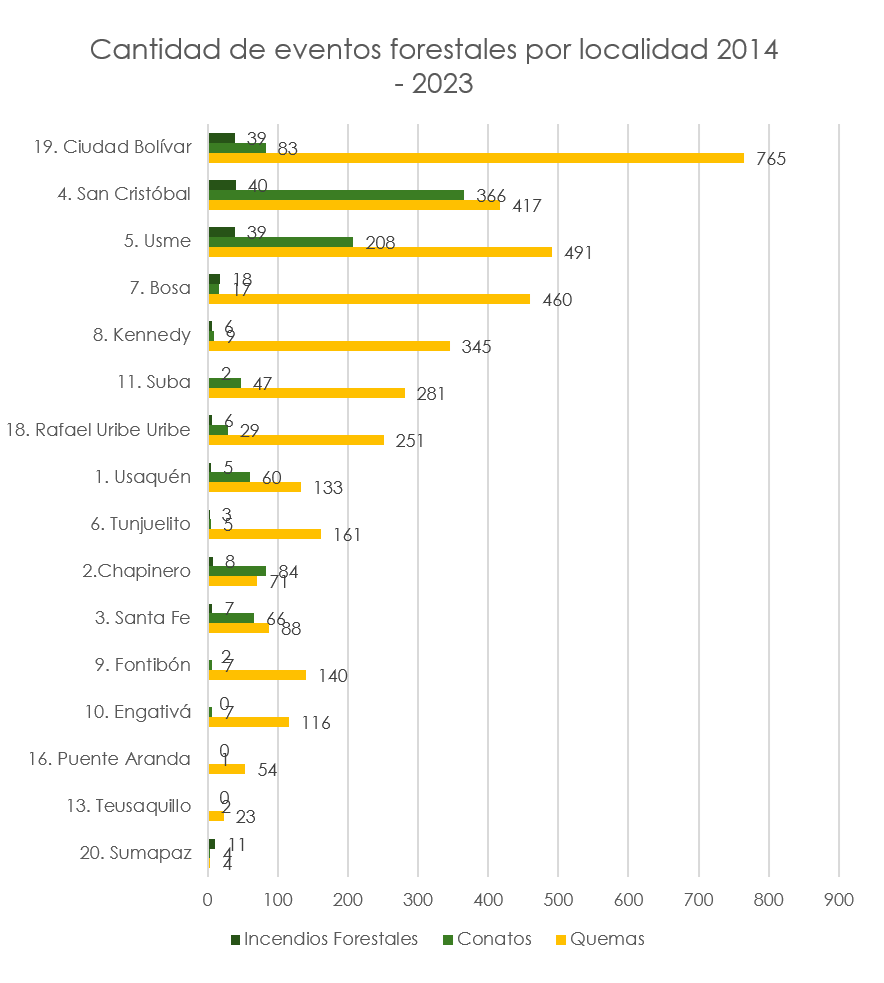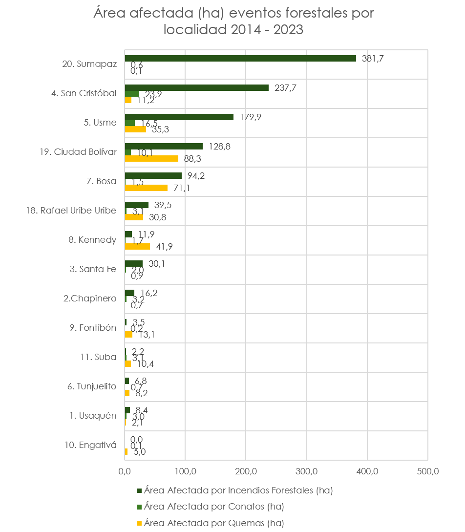 Teniendo en cuenta que a partir del año 2014 se cuenta con la información de ocurrencia de eventos forestales por localidad, a continuación, se presenta un análisis de cantidad de eventos sucedidos durante el período 2014 a 2023, donde se observa que la localidad con mayor área afectada por eventos forestales fue Sumapaz, seguida de San Cristóbal, Usme, Ciudad Bolívar y Bosa. En cuanto a cantidad de eventos forestales, la localidad que reportó mayor cantidad fue Ciudad Bolívar, seguida de San Cristóbal, Usme y Bosa y. Se puede ver que en Sumapaz ocurren pocos eventos forestales, pero cuando suceden, las áreas afectadas son altas.